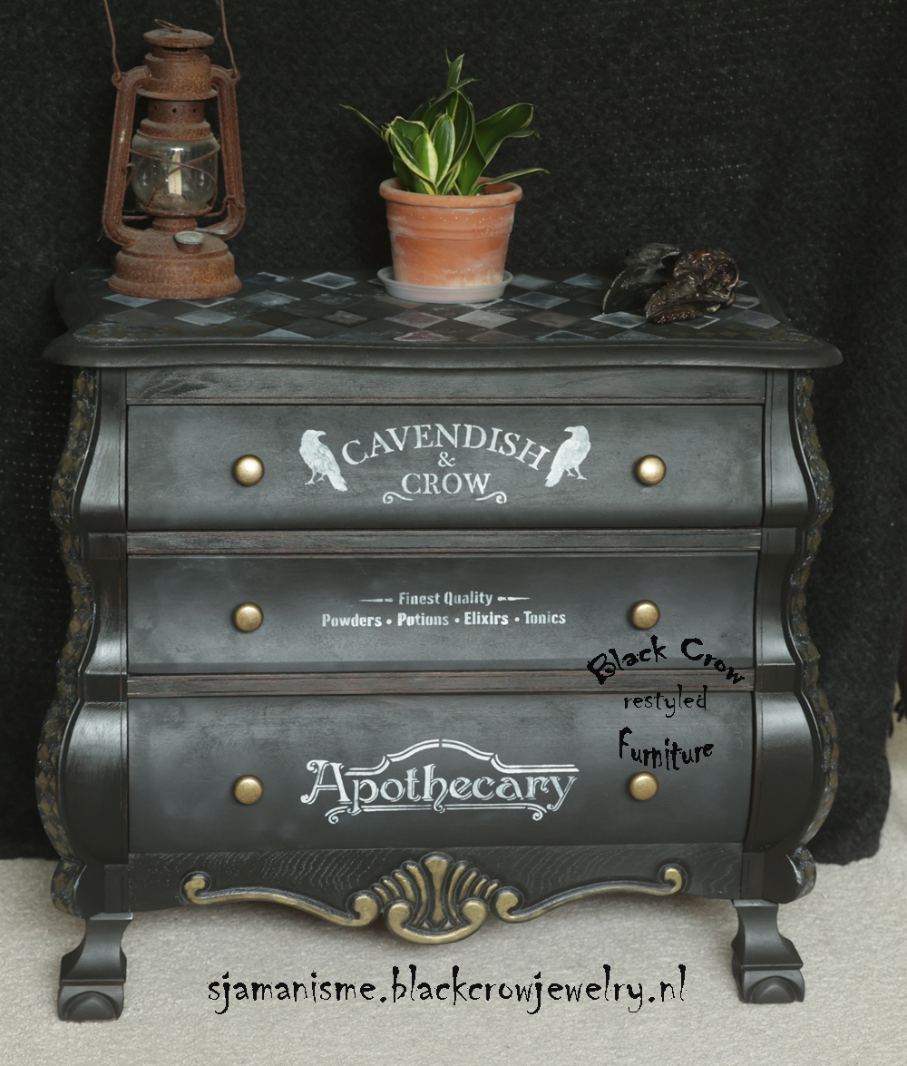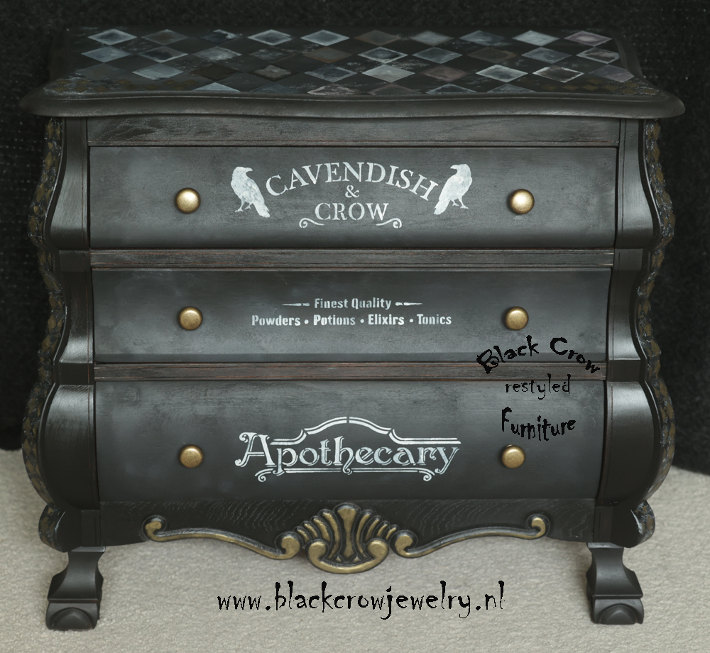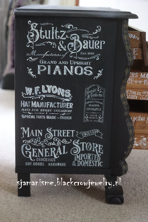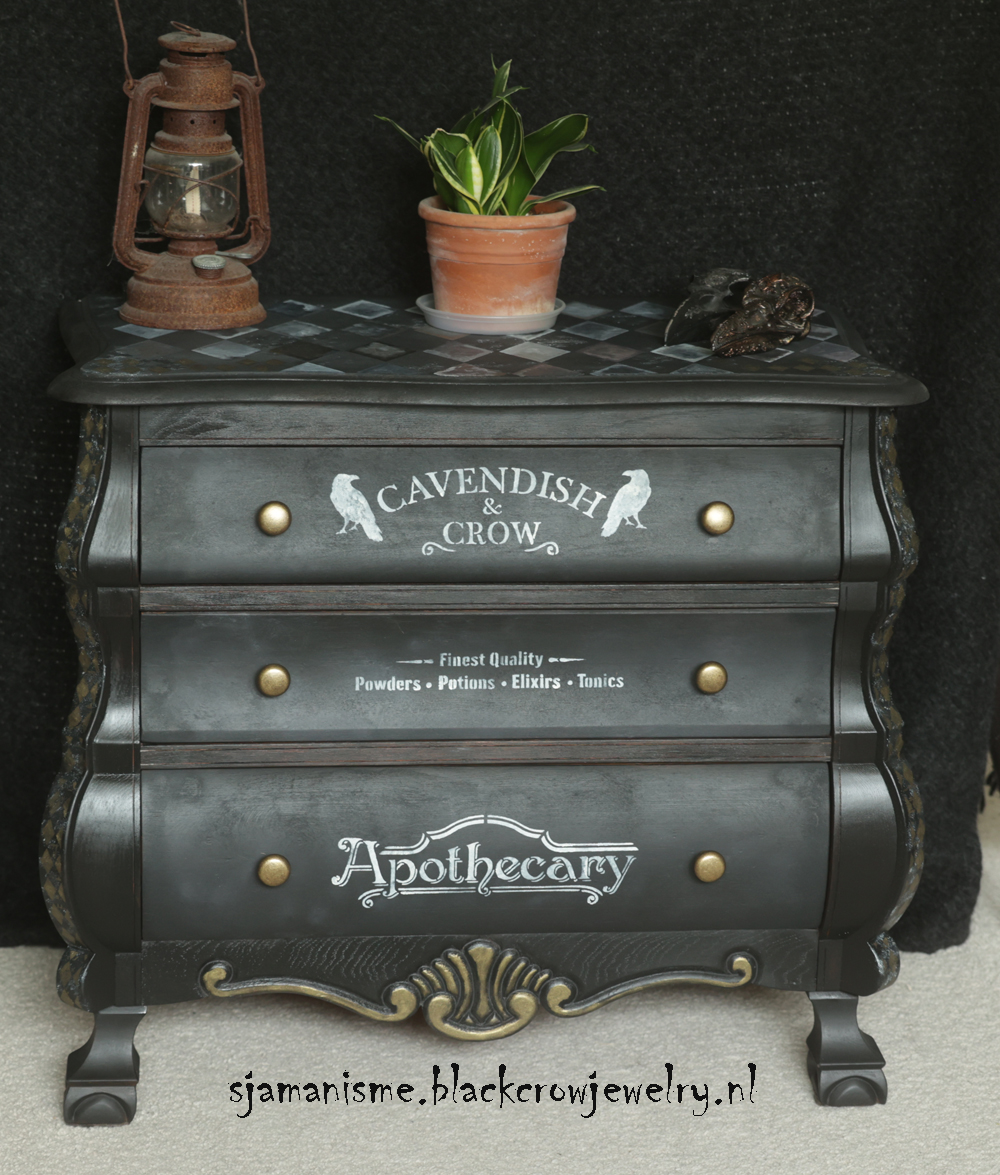 Deze unieke ladenkast is gemaakt met verschillende technieken, black wash met Fusion Mineral Paint, geverfd met Fusion Alchemy, bewerkt met sjablonen en textuur en Metallic verf van Fusion op de details