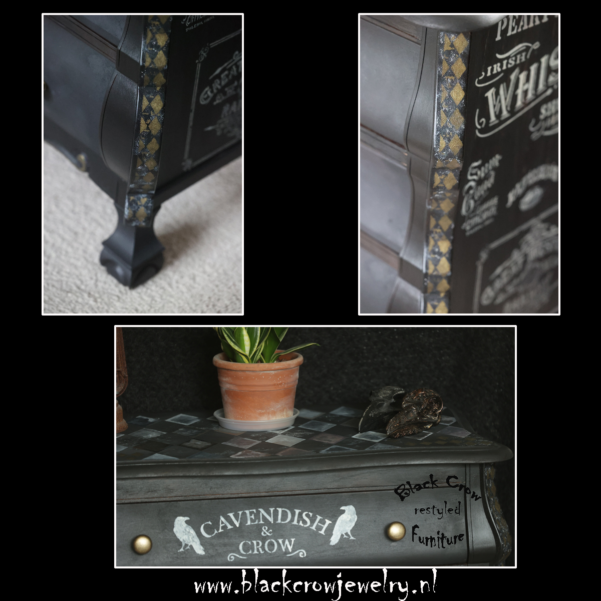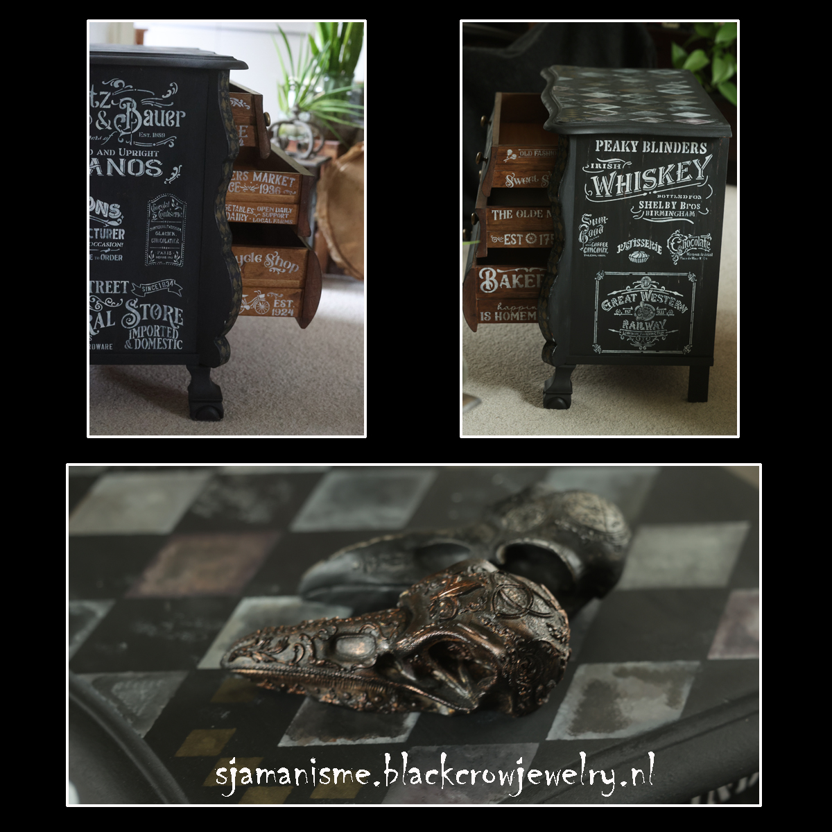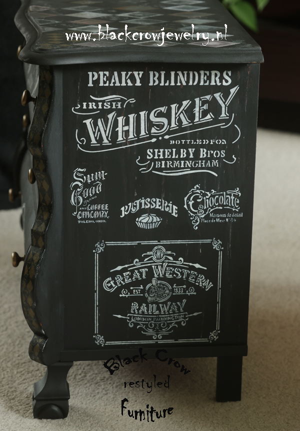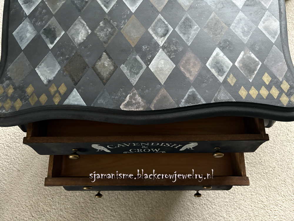 Deze unieke ladenkast is gemaakt met verschillende technieken, black wash met Fusion Mineral Paint, geverfd met Fusion Alchemy, bewerkt met sjablonen en textuur en Metallic verf van Fusion op de details